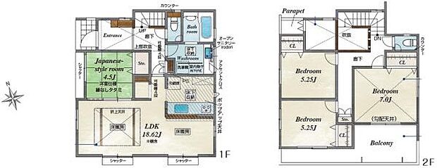 間取り内訳:リビングダイニングキッチン 18.6帖(1階)・和室 4.5畳(1階)・洋室 7帖(2階)・洋室 5.2帖(2階)・洋室 5.2帖(2階)