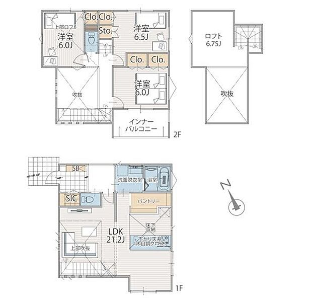 | 間取り | 3LDK 間取り内訳:リビングダイニングキッチン 21.2帖(1階)・洋室 6帖(2階)・洋室 6.5帖(2階)・洋室 6帖(2階) |