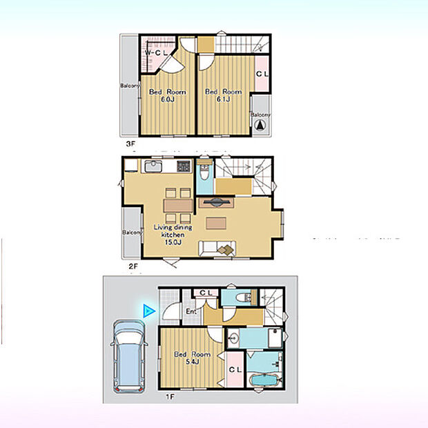 | 間取り | 3LDK 間取り内訳:リビングダイニングキッチン 15帖・洋室 6.1帖・洋室 6帖・洋室 5.4帖 |