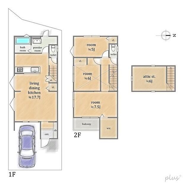 | 間取り | 2SLDK 間取り内訳:リビングダイニングキッチン 17.7帖(1階)・洋室 7.5帖(2階)・洋室 6帖(2階)・収納 5帖(2階) |