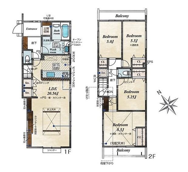 | 間取り | 4LDK 間取り内訳:リビングダイニングキッチン 20.5帖(1階)・洋室 8.5帖(2階)・洋室 5.2帖(2階)・洋室 5.5帖(2階)・洋室 5帖(2階) |