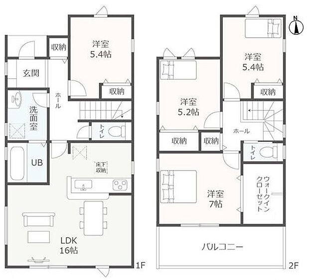 間取り内訳:リビングダイニングキッチン 16帖(1階)・洋室 5.4帖(1階)・洋室 7帖(2階)・洋室 5.4帖(2階)・洋室 5.2帖(2階)