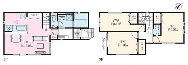 | 間取り | 3LDK 間取り内訳:リビングダイニングキッチン 16帖(1階)・洋室 6.5帖(2階)・洋室 6帖(2階)x2 |
