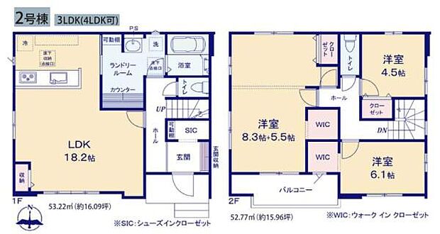 | 間取り | 3LDK 間取り内訳:リビングダイニングキッチン 18.2帖(1階)・洋室 4.5帖(2階)・洋室 6.1帖(2階)・洋室 8.3帖(2階)・洋室 5.5帖(2階) |