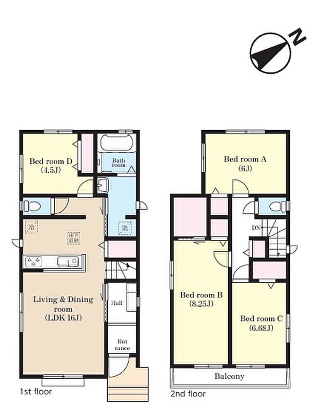 間取り内訳:リビングダイニングキッチン 16帖(1階)・洋室 4.5帖(1階)・洋室 8.3帖(2階)・洋室 6.7帖(2階)・洋室 6帖(2階)