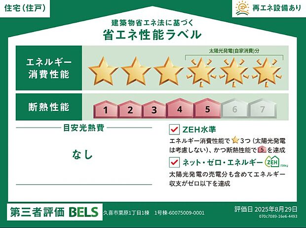 - 星マークの数が多いほどエネルギー消費性能が高いことを示しています。再エネ設備のない住宅は★0~★4の5段階評価、再エネ設備がある住宅は★0~★6の7段階評価となります。