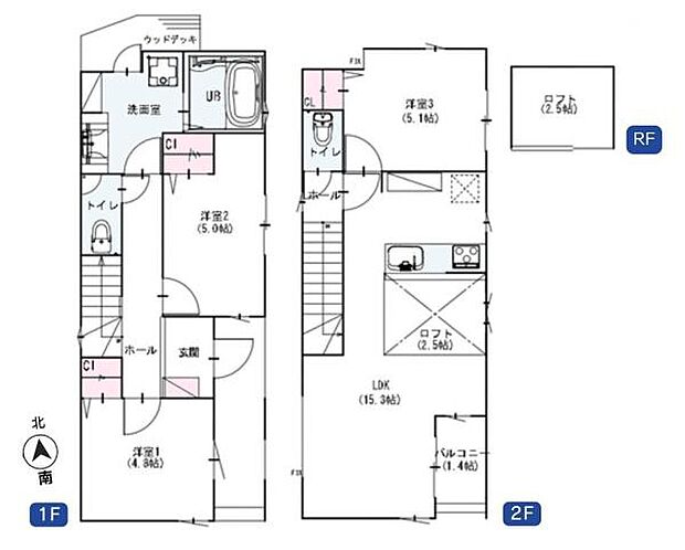 勾配天井のLDK。各居室収納スペース、2.5帖のロフト付き。南道路に面し陽当り良好です。