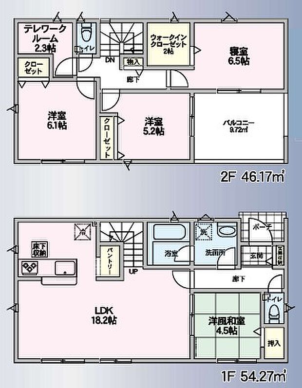 間取り内訳:和室 4.5畳(1階)・リビングダイニングキッチン 18.2帖(1階)・洋室 6.5帖(2階)・洋室 6.1帖(2階)・洋室 5.2帖(2階)・収納 2.3帖(2階)