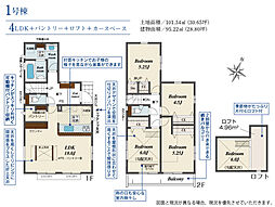 | 間取り | 4LDK(約6帖洋室にロフトあり) 間取り内訳:リビングダイニングキッチン 18帖(1階)・洋室 6帖(2階)・洋室 5.2帖(2階)x2・洋室 4.5帖(2階) |