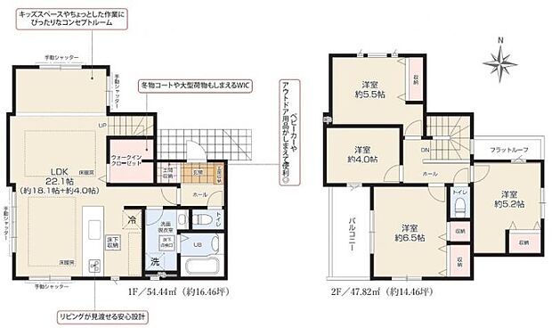 | 間取り | 4LDK 間取り内訳:リビングダイニングキッチン 22.1帖(1階)・洋室 6.5帖(2階)・洋室 5.5帖(2階)・洋室 5.2帖(2階)・洋室 4帖(2階) |