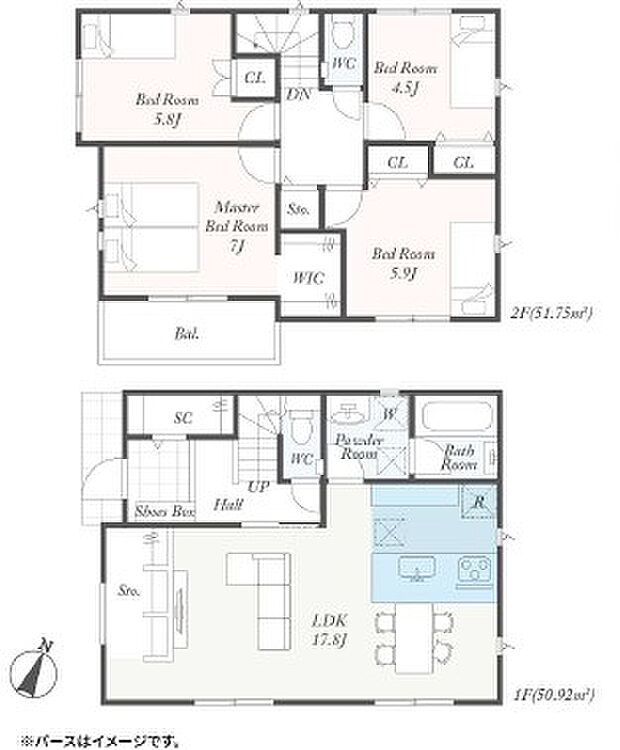 | 間取り | 4LDK 間取り内訳:リビングダイニングキッチン 17.8帖(1階)・洋室 7帖(2階)・洋室 5.9帖(2階)・洋室 5.8帖(2階)・洋室 4.5帖(2階) |