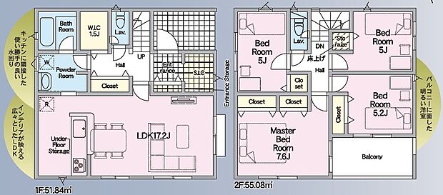 間取り内訳:リビングダイニングキッチン 17.2帖(1階)・洋室 5帖(2階)x2・洋室 5.2帖(2階)・洋室 7.6帖(2階)
