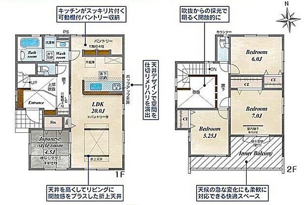間取り内訳:リビングダイニングキッチン 20帖(1階)・和室 4.5畳(1階)・洋室 7帖(2階)・洋室 6帖(2階)・洋室 5.2帖(2階)