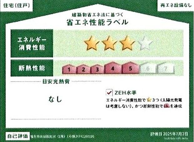 - 星マークの数が多いほどエネルギー消費性能が高いことを示しています。再エネ設備のない住宅は★0~★4の5段階評価、再エネ設備がある住宅は★0~★6の7段階評価となります。