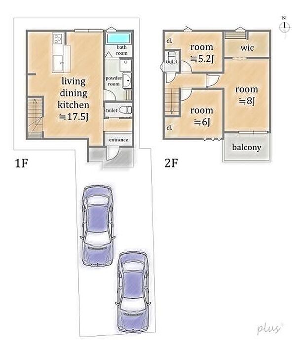 | 間取り | 3LDK 間取り内訳:リビングダイニングキッチン 17.5帖(1階)・洋室 8帖(2階)・洋室 6帖(2階)・洋室 5.2帖(2階) |