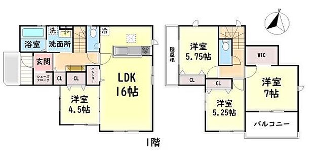 | 間取り | 4LDK 間取り内訳:リビングダイニングキッチン 16帖(1階)・洋室 4.5帖(1階)・洋室 7帖(2階)・洋室 5.7帖(2階)・洋室 5.2帖(2階) |