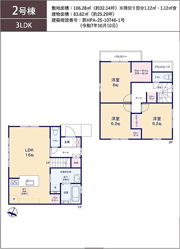 | 間取り | 3LDK 間取り内訳:リビングダイニングキッチン 15帖(1階)・洋室 5.2帖(2階)x2・洋室 6帖(2階) |