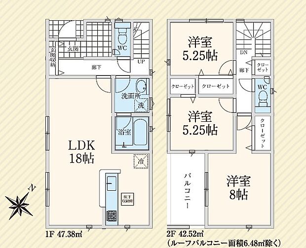 | 間取り | 3LDK 間取り内訳:洋室 8帖(2階)・洋室 5.2帖(2階)・洋室 5.2帖(2階)・リビングダイニングキッチン 18帖(1階) |