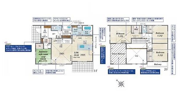 | 間取り | 4LDK 間取り内訳:リビングダイニングキッチン 20帖(1階)・和室 4.5畳(1階)・洋室 7.2帖(2階)・洋室 5.2帖(2階)・洋室 5.2帖(2階) |