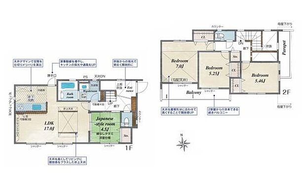 | 間取り | 4LDK 間取り内訳:リビングダイニングキッチン 17帖(1階)・和室 4.5畳(1階)・洋室 7帖(2階)・洋室 5.2帖(2階)・洋室 5.4帖(2階) |
