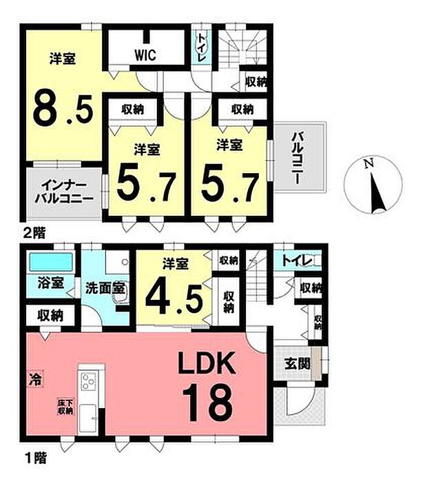 間取り内訳:リビングダイニングキッチン 18帖(1階)・洋室 4.5帖(1階)・洋室 8.5帖(2階)・洋室 5.7帖(2階)・洋室 5.7帖(2階)