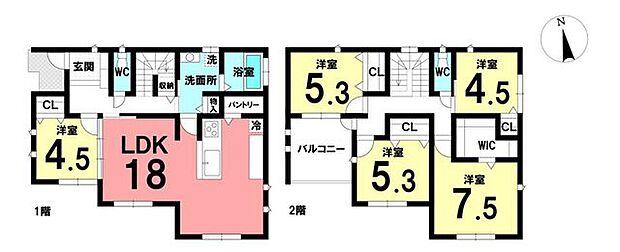 | 間取り | 5LDK 間取り内訳:リビングダイニングキッチン 18帖(1階)・洋室 4.5帖(1階)・洋室 7.5帖(2階)・洋室 5.3帖(2階)・洋室 5.3帖(2階)・洋室 4.5帖(2階) |