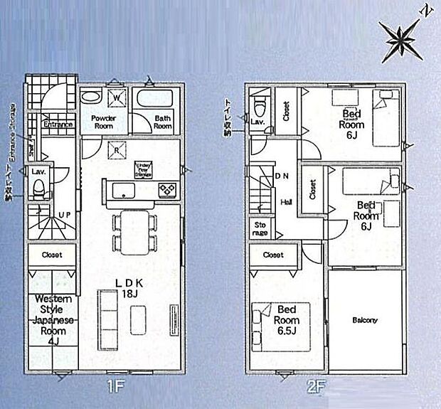 間取り内訳:リビングダイニングキッチン 18帖(1階)・洋室 6.5帖(2階)・洋室 6帖(2階)・洋室 6帖(2階)