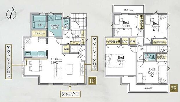 | 間取り | 4LDK 間取り内訳:リビングダイニングキッチン 19.6帖(1階)・洋室 8帖(2階)・洋室 6帖(2階)・洋室 5.2帖(2階)・洋室 5.2帖(2階) |