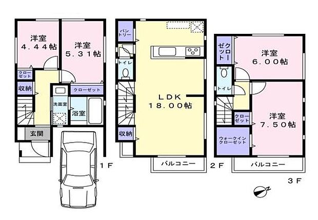 | 間取り | 4LDK 間取り内訳:洋室 4.4帖(1階)・洋室 5.3帖(1階)・リビングダイニングキッチン 18帖(2階)・洋室 6帖(3階)・洋室 7.5帖(3階) |