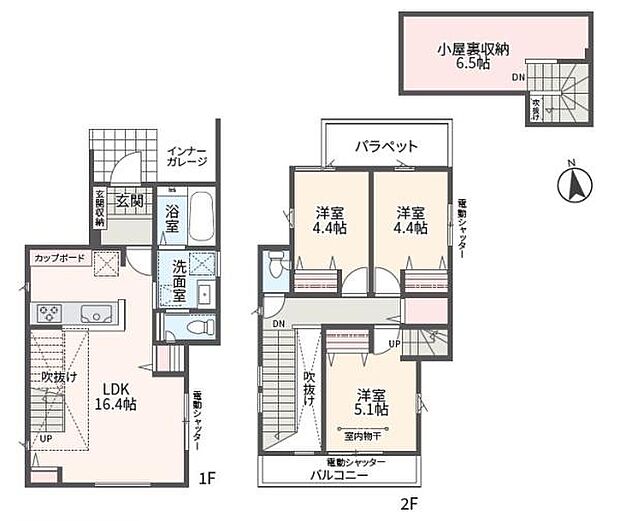 | 間取り | 3LDK 間取り内訳:リビングダイニングキッチン 16.4帖(1階)・洋室 4.4帖(2階)・洋室 4.4帖(2階)・洋室 5.1帖(2階) |