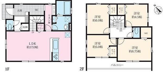 | 間取り | 4LDK 間取り内訳:洋室 6.7帖(2階)・洋室 6帖(2階)・洋室 5帖(2階)・洋室 4.5帖(2階)・リビングダイニングキッチン 17帖(1階) |