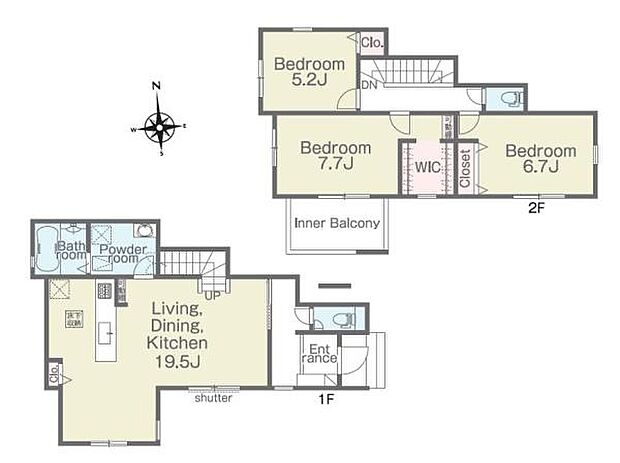 間取り内訳:洋室 5.2帖(2階)・洋室 7.7帖(2階)・洋室 6.7帖(2階)・リビングダイニングキッチン 19.5帖(1階)