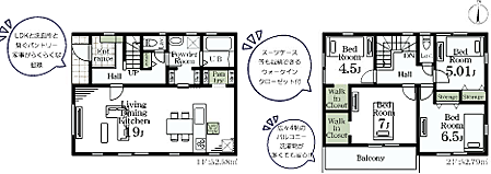 | 間取り | 4LDK 間取り内訳:リビングダイニングキッチン 19帖(1階)・洋室 7帖(2階)・洋室 6.5帖(2階)・洋室 5帖(2階)・洋室 4.5帖(2階) |