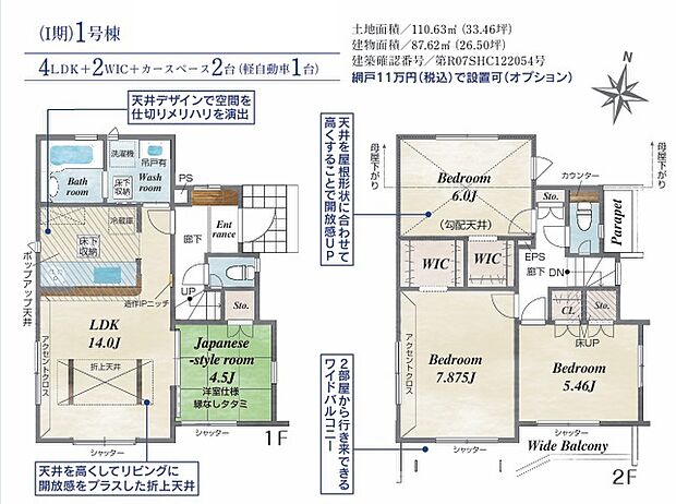 | 間取り | 4LDK 間取り内訳:リビングダイニングキッチン 14帖(1階)・和室 4.5畳(1階)・洋室 5.4帖(2階)・洋室 6帖(2階)・洋室 7.8帖(2階) |