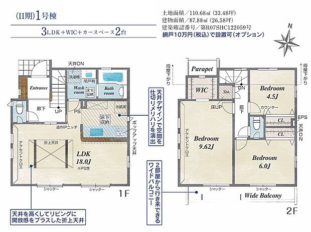 | 間取り | 3LDK 間取り内訳:リビングダイニングキッチン 18帖(1階)・和室 4.5畳(1階)・洋室 6帖(2階)・洋室 9.6帖(2階) |