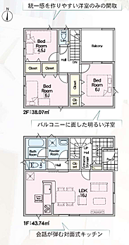 | 間取り | 3LDK 間取り内訳:リビングダイニングキッチン 16帖(1階)・洋室 4.5帖(2階)・洋室 6帖(2階)x2 |