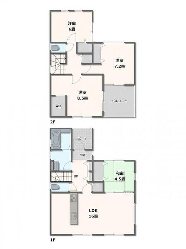 | 間取り | 4LDK 間取り内訳:リビングダイニングキッチン 16帖(1階)・和室 4.5畳(1階)・洋室 8.5帖(2階)・洋室 7.2帖(2階)・洋室 6帖(2階) |