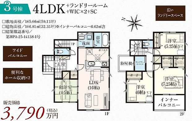 ◆都市ガス◆ランドリールーム付◆ZEH水準、設計住宅性能評価・建設住宅性能評価取得物件◆WIC2か所・シューズクローク付きで収納に大変便利です。