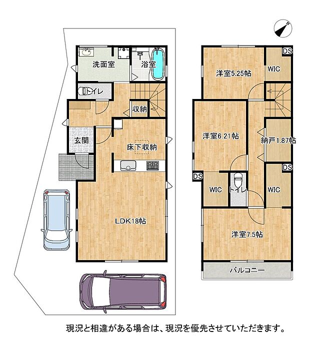 | 間取り | 3LDK 間取り内訳:リビングダイニングキッチン 18帖(1階)・洋室 7.5帖(2階)・洋室 6.2帖(2階)・洋室 5.2帖(2階) |