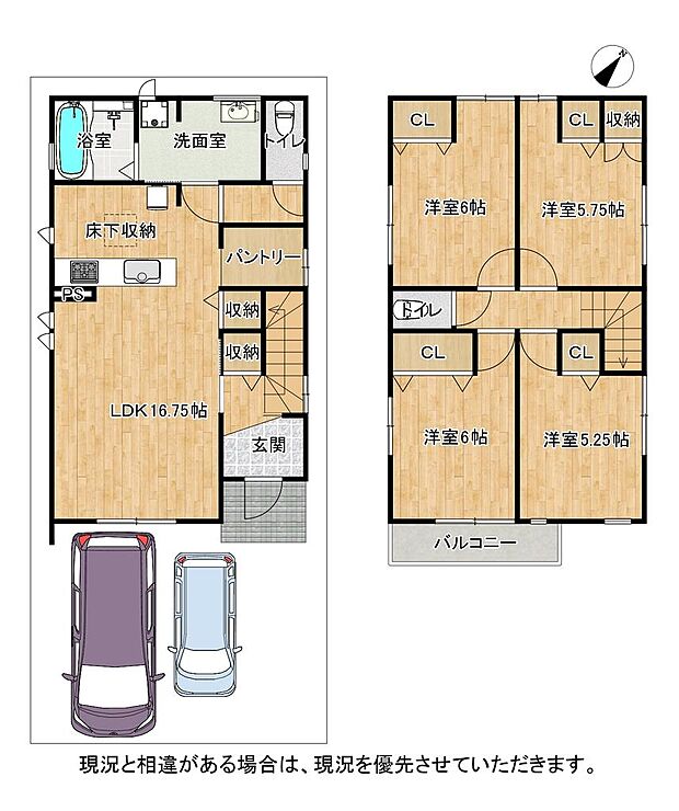| 間取り | 4LDK 間取り内訳:リビングダイニングキッチン 16.7帖(1階)・洋室 6帖(2階)x2・洋室 5.7帖(2階)・洋室 5.2帖(2階) |