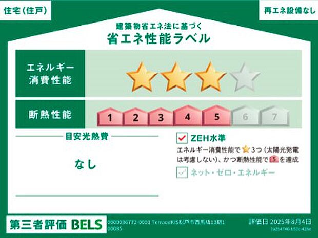 - 星マークの数が多いほどエネルギー消費性能が高いことを示しています。再エネ設備のない住宅は★0~★4の5段階評価、再エネ設備がある住宅は★0~★6の7段階評価となります。