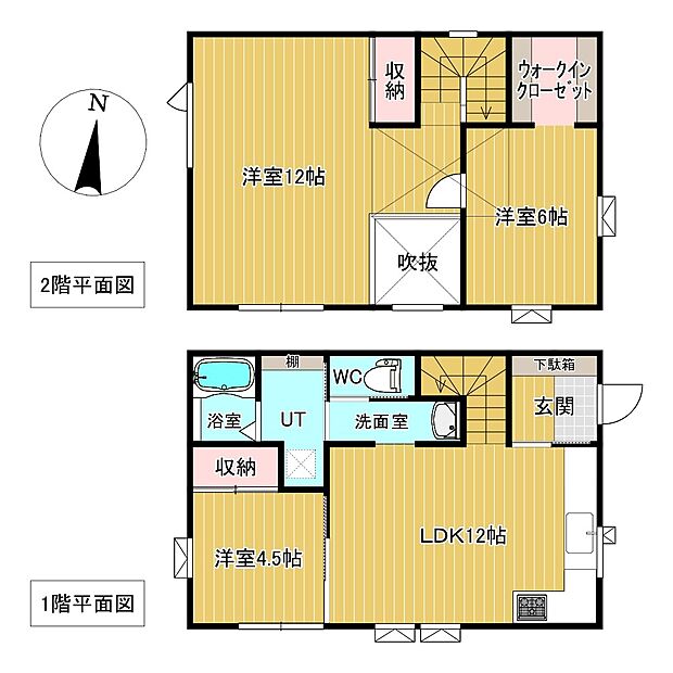| 間取り | 3LDK 間取り内訳:リビングダイニングキッチン 12帖(1階)・洋室 4.5帖(1階)・洋室 6帖(2階)・洋室 12帖(2階) |