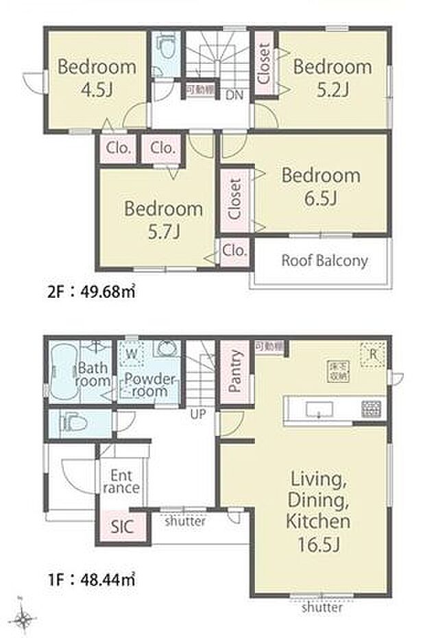 | 間取り | 4LDK 間取り内訳:リビングダイニングキッチン 16.5帖(1階)・洋室 6.5帖(2階)・洋室 5.7帖(2階)・洋室 5.2帖(2階)・洋室 4.5帖(2階) |