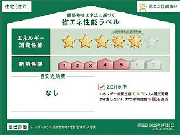 - 星マークの数が多いほどエネルギー消費性能が高いことを示しています。再エネ設備のない住宅は★0~★4の5段階評価、再エネ設備がある住宅は★0~★6の7段階評価となります。