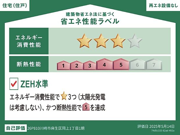 - 星マークの数が多いほどエネルギー消費性能が高いことを示しています。再エネ設備のない住宅は★0~★4の5段階評価、再エネ設備がある住宅は★0~★6の7段階評価となります。