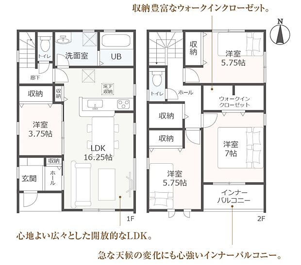 ◆家族が自然に集まる!広々リビング16.25帖♪リビング・ダイニングが見渡せるフラットキッチン♪豊富な収納スペースでお部屋はいつもスッキリ♪急な雨でも安心!インナーバルコニー◎駐車場2台可能♪