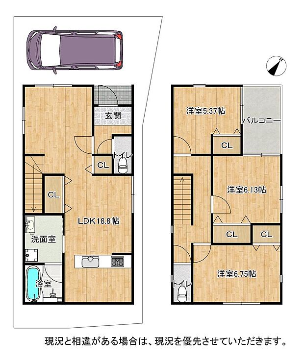 | 間取り | 3LDK 間取り内訳:リビングダイニングキッチン 18.8帖(1階)・洋室 6.7帖(2階)・洋室 6.1帖(2階)・洋室 5.3帖(2階) |
