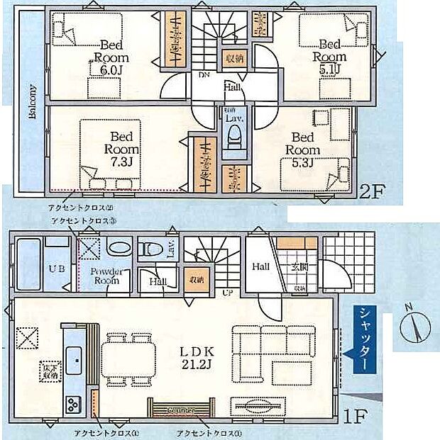 | 間取り | 4LDK 間取り内訳:リビングダイニングキッチン 21.2帖(1階)・洋室 7.3帖(2階)・洋室 6帖(2階)・洋室 5.3帖(2階)・洋室 5.1帖(2階) |