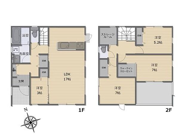 | 間取り | 3LDK+S(納戸)・4LDK | 建物階 | 木造在来軸組工法2階建(910モジュール) |
