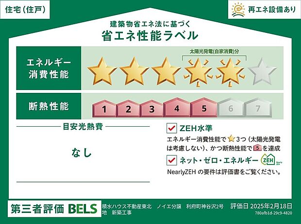 星マークの数が多いほどエネルギー消費性能が高いことを示しています。再エネ設備のない住宅は★0~★4の5段階評価、再エネ設備がある住宅は★0~★6の7段階評価となります。